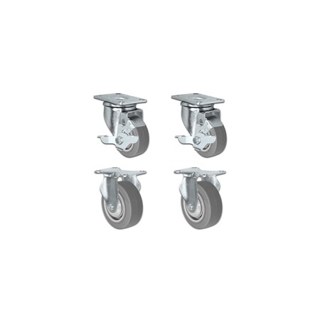 3" Gray Thermo Plastic Rubber Wheel - 2 Locking Swivel & 2 Rigid Casters - Set of 4 - 900 lbs Capacity Per Set CasterHQ's 3 inch Gray Non-Marking TPR Wheel comes assembled in a Swivel Caster Yoke. Our Wheel is made from a proprietary Thermo Plastic Rubber compound molded to a polyolefin core. These wheels are known as the FX Formula XS Rubber Wheel. Our wheels are specially engineered to withstand harsh chemical environments and are resistant to greases, blood, oils, brine, solvents, and water including wash down applications. Our FX Formula XS Rubber Wheels are completely non-marking, quiet to roll, and soft to roll over obstacles and debris with ease. FX Formula Wheels come with Precision Ball Bearings which is a huge upgrade from most wheels with a plain bore. Precision Bearings help the caster roll easier and quieter while providing a very smooth ride. We've also upgraded these with small thread guards to protect the bearings from dust, debris, hair, and threads from accumulating between the axle and bearing to allow these casters and wheels a much longer lifespan than the competition. These wheels perform great on floors that contain metal shavings, gravel, dirt, and/or debris. We designed these to never flat spot which means you can leave your equipment or cart sitting on these wheels for longer periods of time and the wheel tread will remain resilient and always perform like new. These wheels are commonly seen on high-end furniture dollies, carts, dolly cart casters, food service cart casters, material handling cart casters, maintenance cart casters, stocking cart casters, clean room cart casters, computer cart casters, laboratory cart casters, medical cart casters, computer rack casters, and many institutional cart casters. These wheels are made to outperform and outlast the competition. The Swivel Caster Yokes contains a double ball raceway for easy maneuverability and turning as well as Heavy Gauge Cold Rolled Steel