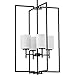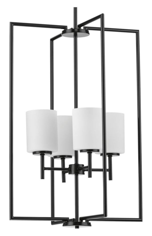 - Four-light pendant with a rectangular silhouette extending above and below the etched-glass shades makes a strong, modern statement