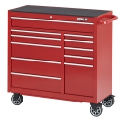 'Rolling Cabinet, Professional Series, Heavy Duty, Width 41 In., Depth 18 In., Height 42-1/2 In., Number of Drawers 11, Red, Drawer Color Red, Drawer Capacity 110 lb., Ball Bearing, Full Extension Drawer Slides, E-Coat Finish, Storage Capacity 15,315 cu. in., Load Rating 3500 lb., Caster Size 6 In. x 2 In., Number of Shelves 0, Steel, Body:0.045, Drawers: 0.033 Gauge, Work Surface Material Steel, Caster Wheel Material Polypropylene, Caster Type (2) Swivel, (2) Locking, Internal Keyed Tubular'