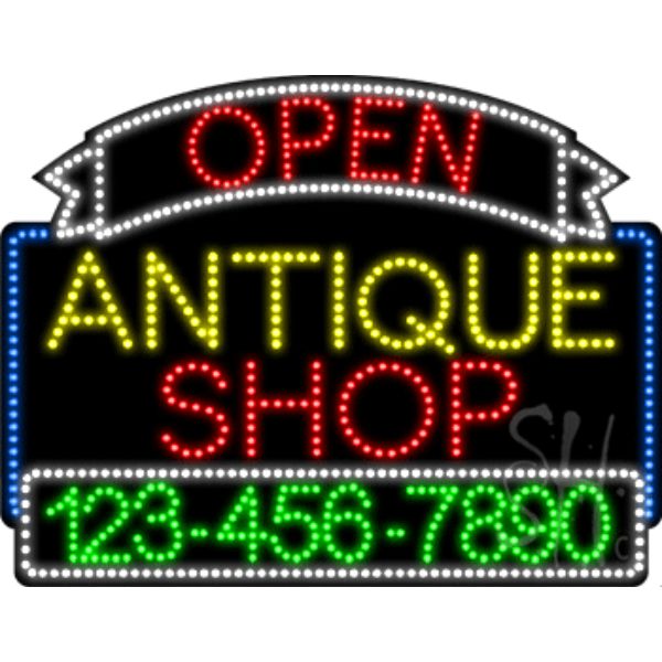 Everything Neon L100-6848 24 x 31 x 1 in. Antique Shop Open with Phone Number Animated LED Sign - Yellow, Red & Whit