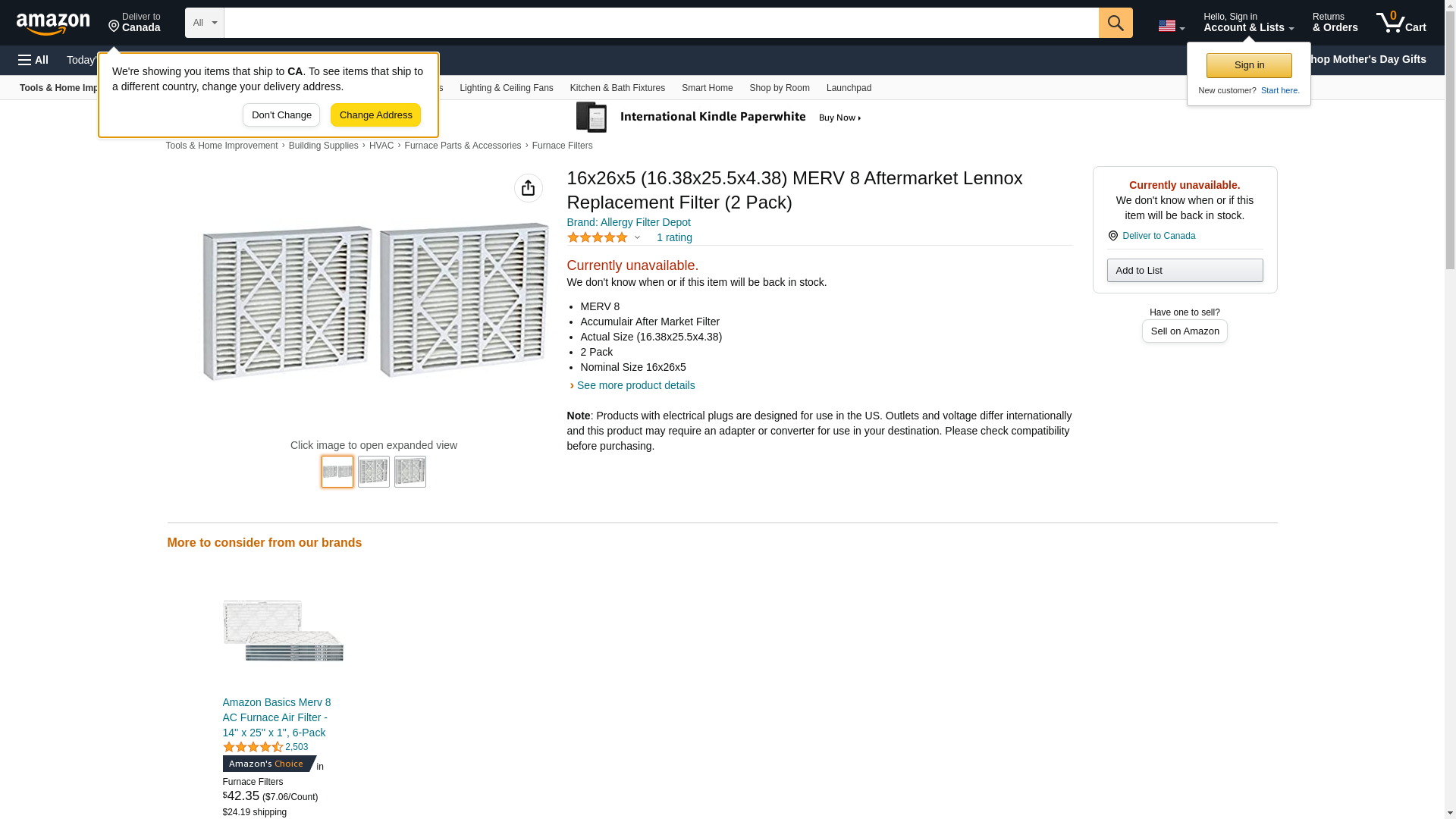 16x26x5 (16.38x25.5x4.38) MERV 8 Lennox Replacement Filter
