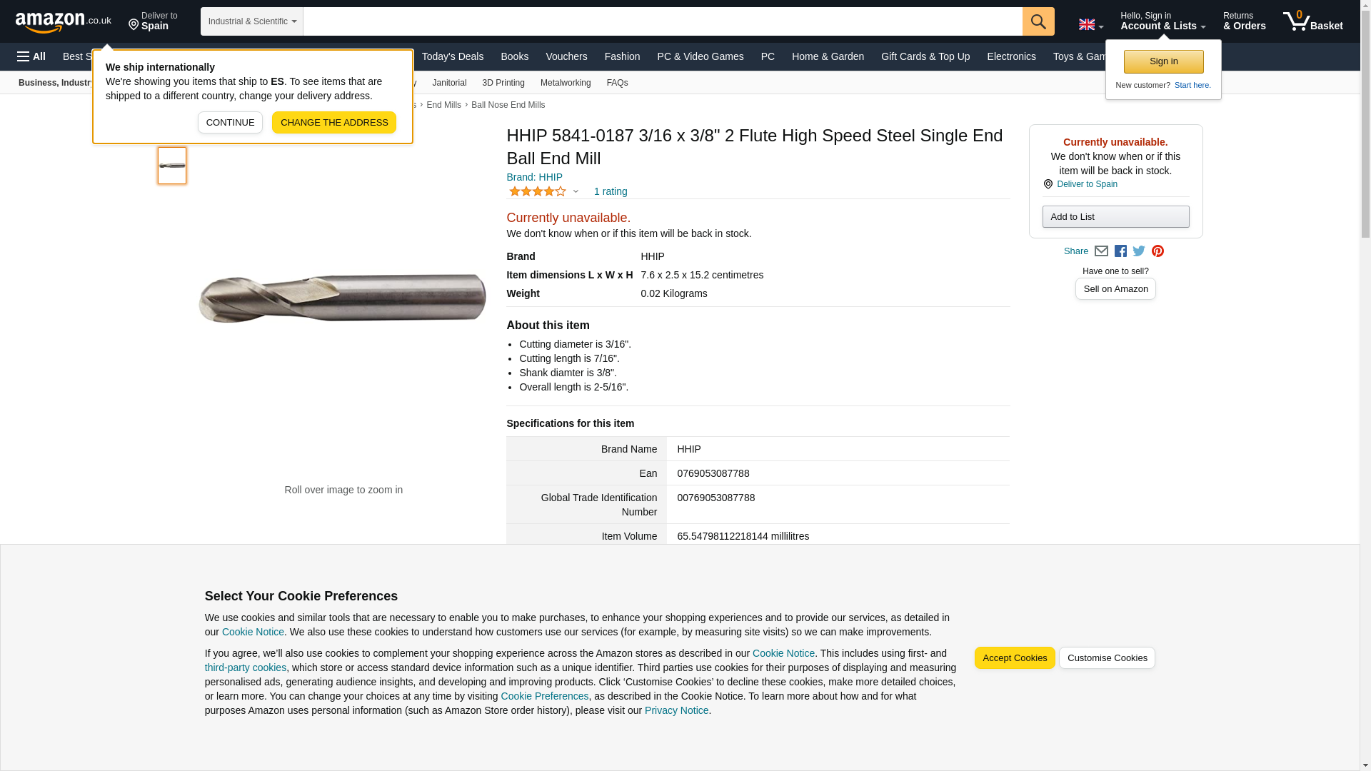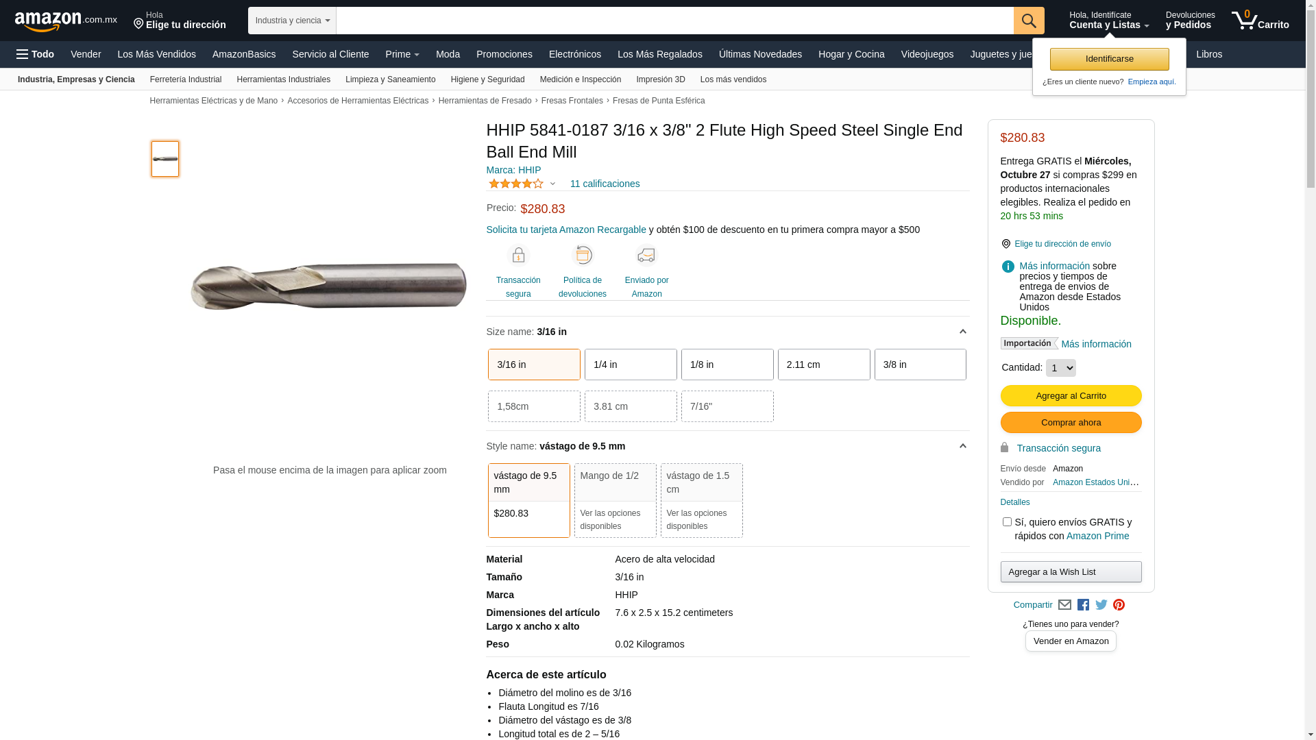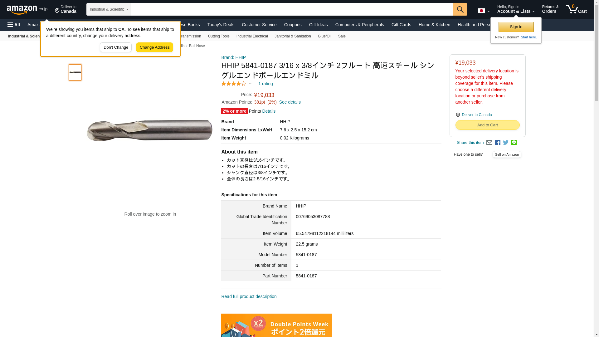 HHIP 5841-0187 3/16 x 3/8" 2 Flute High Speed Steel Single End Ball End Mill