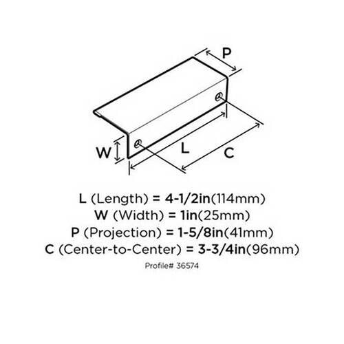 BP36574ORB Finish: Oil Rubbed Bronze Features: Style: -Contemporary. Primary Material: -Metal. Fasteners Included: -Yes. Pull Type: -Finger pull. Dimensions: Overall Height - Top to Bottom: -0.98". Overall Width - Side to Side: -4.57". Overall Depth - Front to Back: -1.65". Overall Product Weight: -0.09 lbs.