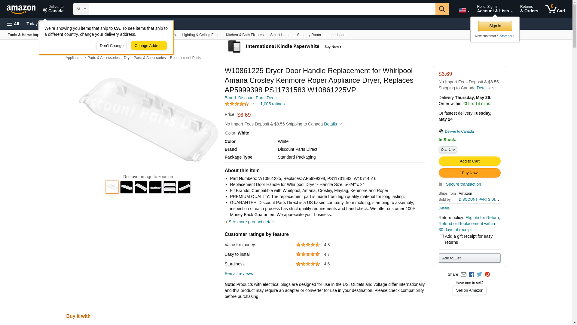 W10861225 Dryer Door Handle a replacement door handle for your front loading dryer door. If your handle is damaged or missing, you can replace it with this part. This repair requires no tools; simply snap the new handle into place.<br><br> <b>Replaces the following part numbers:</b><br> AP5999398, PS11731583 <br><br><b>Works for brands:</b><br> Whirlpool, Amana, Crosley, Kenmore and Roper . <br><br> <b>Fit Models:</b><br> 1CWED4900DW0, 1MWED1750EM0, 3DWED4900YW2, 7MMEDX655EW0, 7MMGDX655EW0, 7MWED1650EQ0, 7MWED1800EM0, 7MWED1900EW0, 7MWGD1750EQ0, 7MWGD1800EM0, 7MWGD1850EI0, 7MWGD1900EW0, 7MWGD1950EI0, 7MWGD2150EN0, 7MWGD7000EW0, 7MWGD9919EM0, CED126SDW1, CED137SDW1, CED147SDW2, CGD126SDW2, CGD137SDW2, CGD137SDW3, CGD147SDW2, MEDB755DW2, MEDC215EW1, MEDC415EW1, MEDC555DW2, MEDX655DW1, MEDX6STBW1, MGDB755DW2, MGDC215EW1, MGDC415EW1, MGDC555DW2, MGDX655DW1, MGDX6STBW1, NED4655EW1, NED4705EW1 NGD4655EW1 NGD4705EW1, WED4616FW0, WED4810EW1, WED4815EW1, WED4915EW1, WED4975EW1, WED4985EW0, WED4995EW1, WED49STBW1, WED5000DW2, WED7000DW1, WED7300DW1, WGD4616FW0, WGD4810EW1, WGD4815EW1, WGD4915EW1, WGD4975EW1, WGD4985EW0, WGD4995EW1, WGD49STBW1, WGD5000DW2, WGD7000DW0, WGD7300DW1, YIED4671EW1, YIED4771EW1, YMEDB755DW2, YMEDC415EW1, YMEDC555DW1, YMEDX6STBW1, YNED4655EW1, YNED4755EW1, YWED4616FW0, YWED4815EW1, YWED4915EW1, YWED49STBW1, YWED7300DW1 <br><br> <b>Contact Us</b><br> If you are not sure if part is correct, ask us in Customer questions & answers section or contact us by visiting the Discount Parts Direct storefront.<br><br> <b>Business Wholesale</b><br> We are a small local company from Houston, Texas offer discount parts for retail and wholesale. If you need to purchase parts for business , please contact us for lower rates.<br>Product