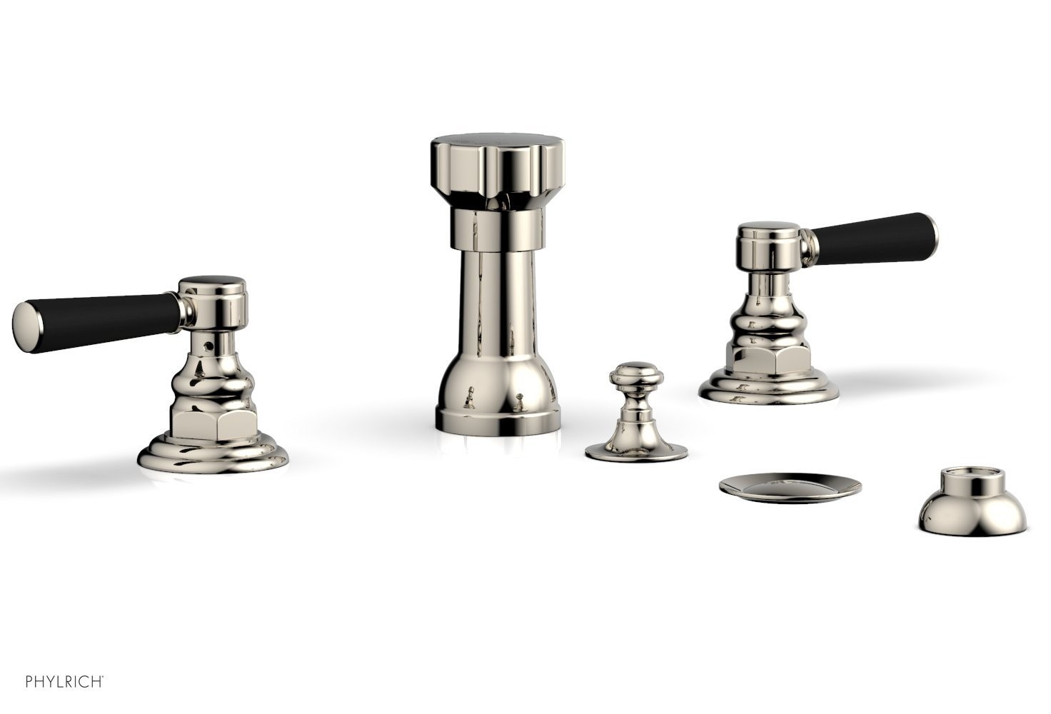 PHYLRICH 161-62/014X040 HENRI FOUR HOLE DECK MOUNT BIDET FAUCET SET WITH SATIN BLACK LEVER HANDLES, POLISHED NICKEL