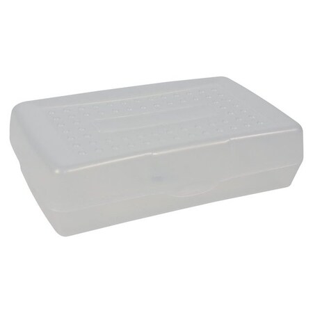 This pencil box has a solid one-piece construction using advanced plastic molding techniques. Lid snaps shut with integrated latch. Made of clear, hard plastic. Measures 8-3/8 x 5-5/8 x 2-1/2 inches, Includes:1 Pencil Box