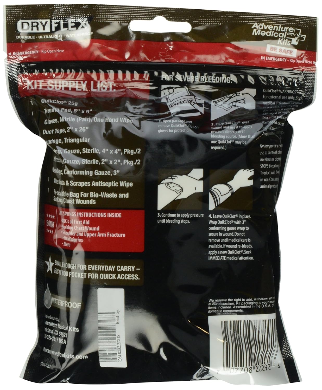 Tactical professionals know that excessive equipment only gets in the way in an emergency. With that in mind, the Trauma Pak with QuikClot is designed to stop bleeding and control serious trauma at the scene so more advanced care can be sought later. Packed in a tough, waterproof pouch sized to fit in any pocket, the Trauma Pak with QuikClot is easy to deploy: just rip the top off, pull out the QuikClot dressing to apply to any life-threatening bleeding, and use the other bandages and dressings as needed. An instruction pamphlet with information on treating traumatic injuries provides is included as well.