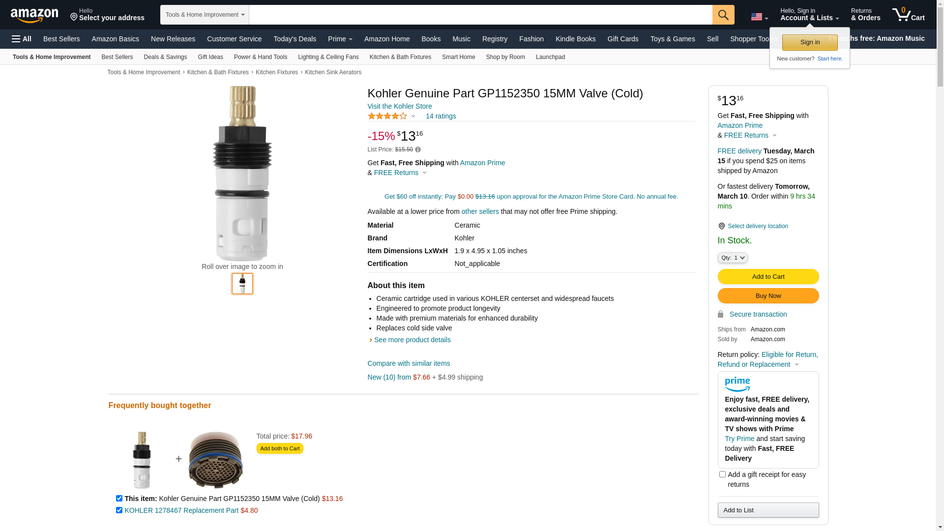 Kohler Genuine Part GP1152350 15MM Valve (Cold)