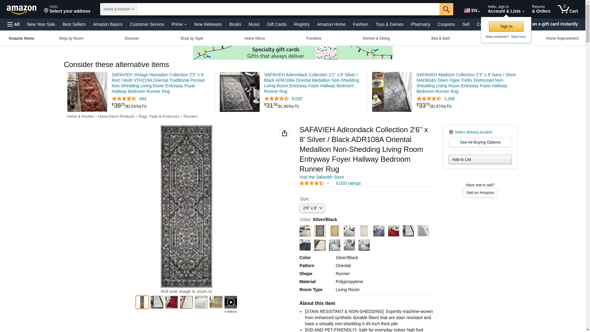 Safavieh ADR108A-28 2 ft.-6 in. x 8 ft. Runner Casual Adirondack, Silver and Black Power Loomed Rug