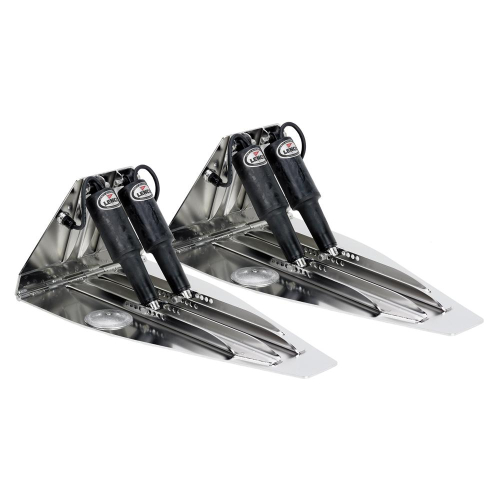 Providing the high performance boat owner every advantageRadiused blades give maximum clearance for multiple outboard applications and reduces cavitation to the prop. The stylish design gives maximum performance and is built for extreme duty applications. Fast response electric actuators for precise control. Fully submersible. All Plug & Play Deutsch connections. Blades are Electro-Polished 7 Gauge flat- 304 SS with 3/8" diameter hinge pin. Extreme Duty actuators with 3/8" SS bolts. Kit is factory assembled with full transom back plate, mechanical strain relief cable seal, adjustable C-channel mounting brackets, and 3.75" sacrificial anodes.Electric ball-screw design actuator make the ride faster, smoother and more stable by providing instant response.Extreme duty-actuator provides more strength and durability without any of the "drifting" associated with hydraulic trim tab systemsThe flat, angle-cut blades help reduce drag and spray while the welded brackets and back-plate create one complete, heavy-duty unit.Each Kit Contains2 SS Trim Tab Planes4 Actuators with 6' Lead and Deutsch PlanesBoat Mounting Hardware supplied by customerActuator Extension Harnesses (4 for Dual Actuator Application) will be required