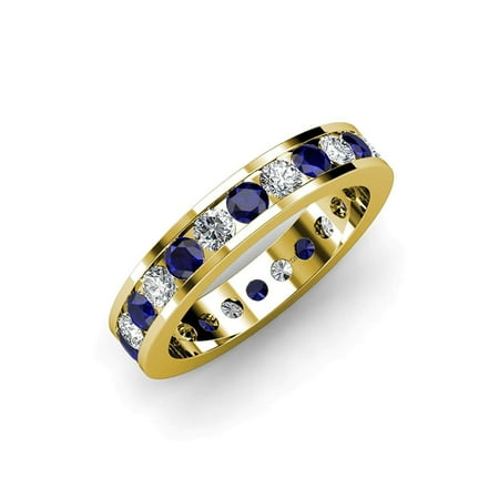 <ul> <li>2.78 ct tw to 3.28 ct tw Round Diamond & Blue Sapphire Channel Set Eternity Band in 14K Yellow Gold.</li> <li>SI2-I1-Clarity, G-H-Color Diamond.</li> <li>Gemstones may have been Treated to Improve their Appearance or Durability & may Require Special Care.</li> <li>The Natural Properties & Composition of Mined Gemstones define the Unique Beauty of each Piece. The Image may show Slight Differences to the Actual Stone in Color & Texture.</li> <li>All our Diamonds to our Best Knowledge are not Conflict Diamonds.</li> </ul>