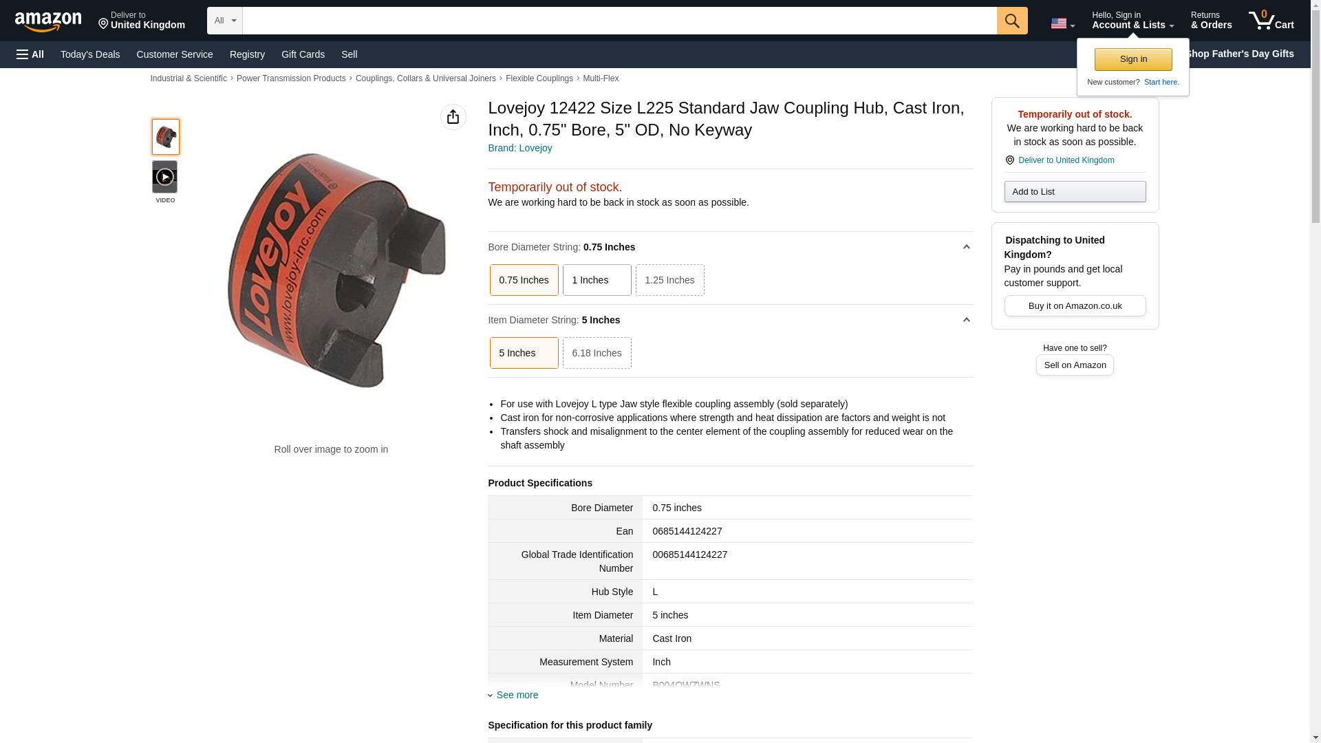 Lovejoy 12422 Size L225 Standard Jaw Coupling Hub, Cast Iron, Inch, 0.75" Bore, 5" OD, No Keyway