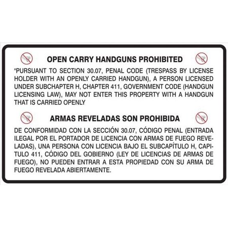 Bilingual Texas 30.06 Regulation Safety Signs: Prohibiting Handguns In A Business Or Other Entity Texas 30.07 Open Carry 24" x 36" Dura-Plastic 1/Each - MACC511XT - Jendco Safety Supply