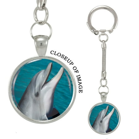 Photograph of a Happy Dolphin Keychain. The image is displayed under photo-optic quality acrylic for a perfectly clear glossy image that is also protected from wear and tear. Carry your keys in style! Or maybe add some fun to your backpack or gym bag! This is a keychain featuring an image protected by museum quality clear acrylic. The image is slightly larger than 1 inch in diameter; slightly larger than a quarter coin. The keychain end features as easy open yet incredibly strong closure mechanism. No more breaking fingernails or chipping teeth trying to pry open those split ring style keychains. Overall length is approximately 4 inches. SKU #33996