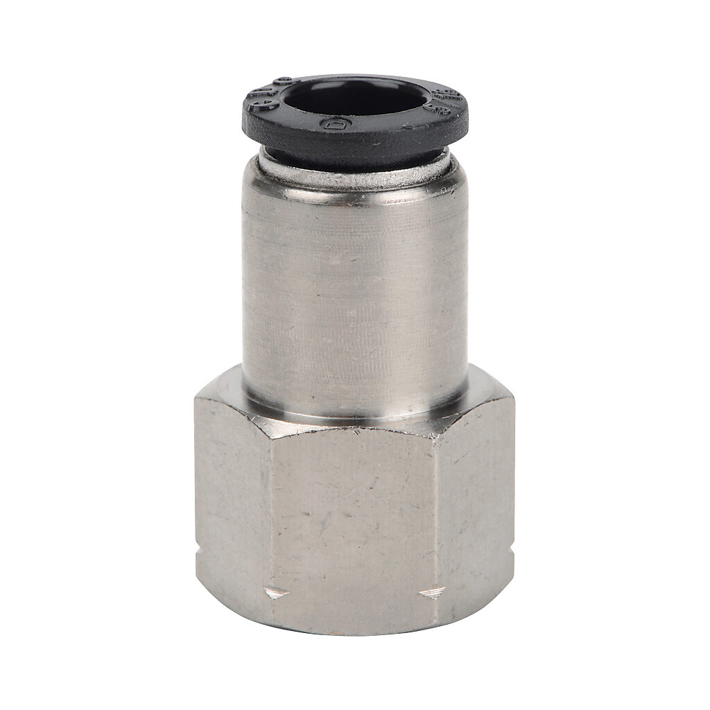 FS516-14N - NITRA pneumatic push-to-connect fitting, female, straight, nickel-plated brass body, nickel-plated brass threads, 5/16in (8mm) tube to 1/4in...