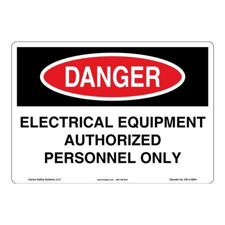 <p><strong>Word Message: </strong><br />ELECTRICAL EQUIPMENT AUTHORIZED PERSONNEL ONLY</p><p><strong>Description: </strong><br />Clarion Safety Systems brings you Danger Electrical Equipment Authorized Personnel Only safety signs (OS1116DH-) which are produced on premium plastic or aluminum material and are designed to meet your OSHA safety sign needs.<p><strong>Material Information:</strong></p> <ul> <li><strong>Material</strong>: (Z1) Outdoor Flexible Polyester</li> <li><strong>Base Materials</strong>: 3M .002 premium white polyester</li> <li><strong>Overlaminate</strong>: 3M .003 ultra-clear weatherable UV resistant</li> <li><strong>Mounting Option</strong>: 3M Premium Structured Acrylic</li> <li><strong>Application</strong>: Indoor/Outdoor</li> <li><strong>MaxTemp</strong> (F): 175</li> <li><strong>MinTemp</strong> (F): -40</li> <li><strong>Chemical Resistance</strong>: Excellent</li> <li><strong>UV Resistance</strong>: Excellent </li> <li><strong>Outdoor durability</strong>: Excellent</li> <li><strong>Storage Stability</strong>: Stable. Optimum storage conditions: 72 F @ 50% relative humidity</li> <li><strong>Expected Life Indoor</strong>: Long term</li> <li><strong>Expected Life Outdoor</strong>: 5 years plus (expected outdoor life may vary due to climatic conditions)</li> <li><strong>RoHS</strong>: Yes</li> <li><strong>CRoHS</strong>: Yes</li> <li><strong>REACH</strong>: Yes</li> </ul>