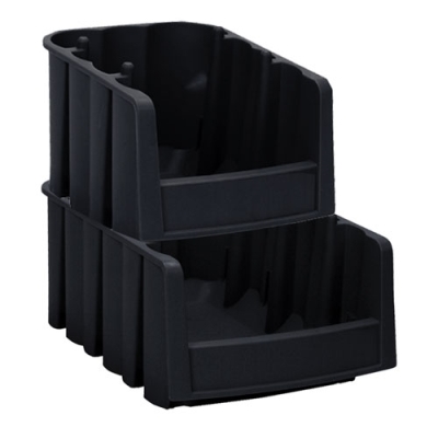 - EFFICIENT- Sized to fit on 12-Inch or 18-Inch deep wire or steel shelving, bins nest when not in use to save space. Same width bins stack on top of each other, wide hopper front provides easy access, unique post and rib design allows bins to stack securely and nest for compact storage, interior corners are rounded and tapered