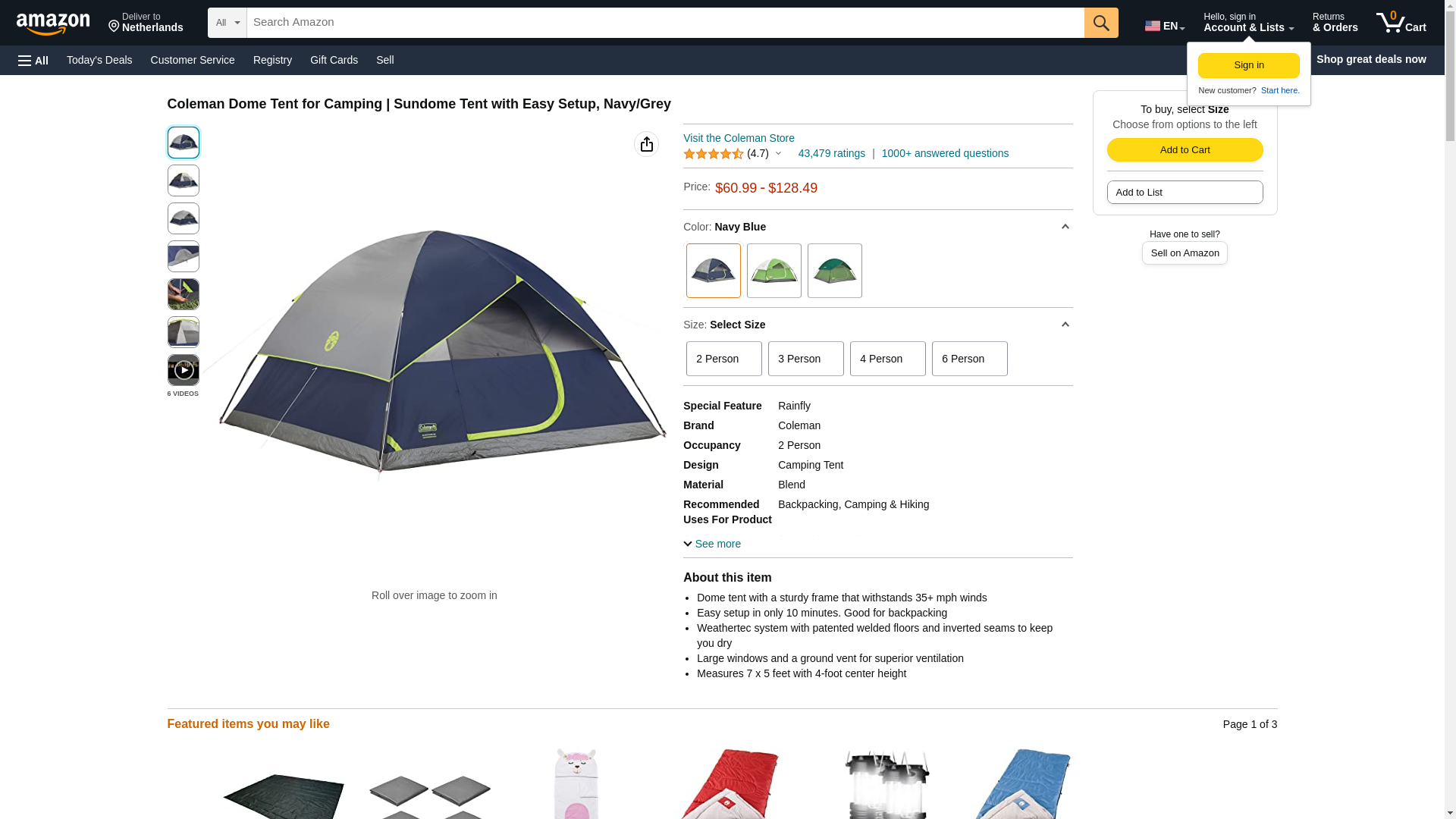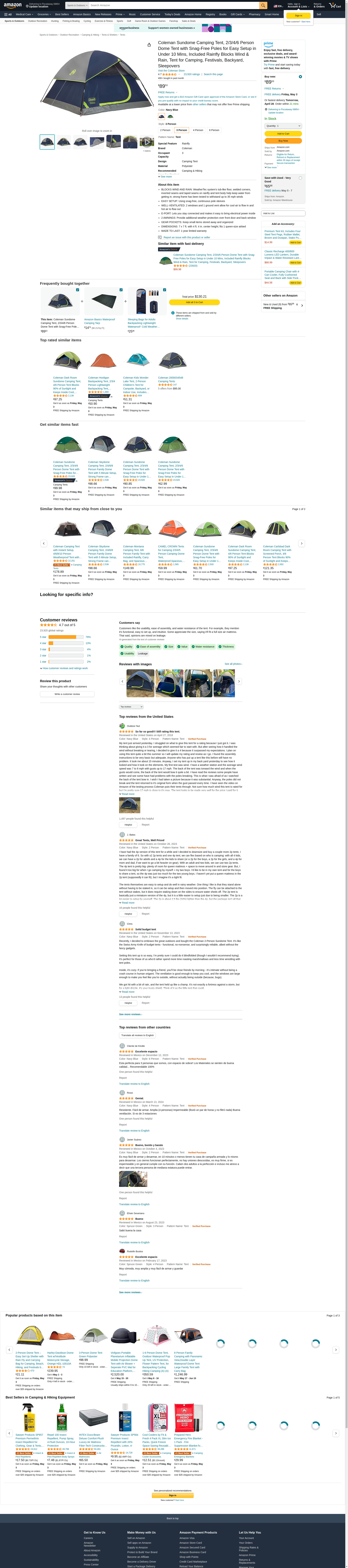Coleman Sundome 3-Person Tent w/Rainfly, Navy/Grey, 7x7ft 2000024580