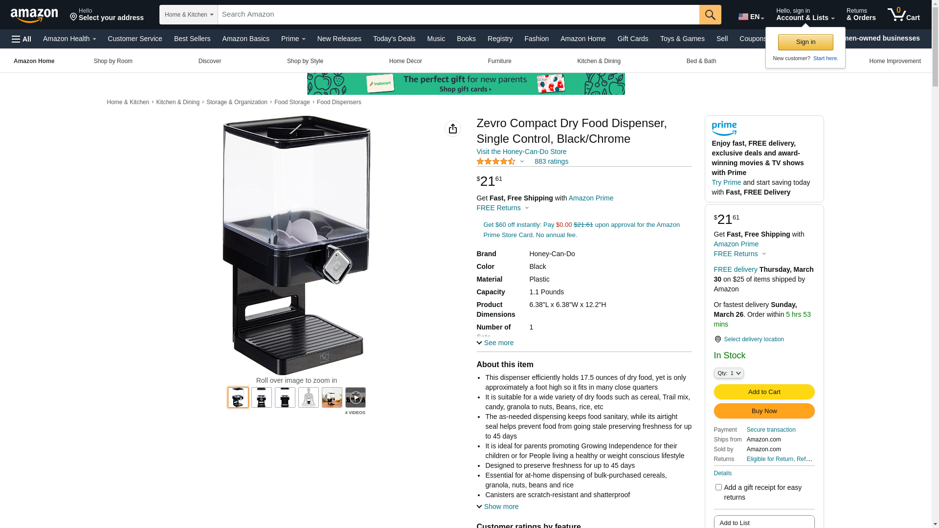 Zevro KCH-06127 Compact Dry Food Dispenser, Single Control, Black/Chrome