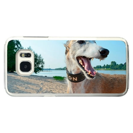Greyhound Dog Puppy At A Lake Smiling At Camera Samsung Galaxy S7 Phone Case. This is our super strong and slim Ice Clear hard plastic case. Not only will your image shine in high gloss, the true color of your phone will also show through the clear case! We also offer custom images too! Just click the following link to see our custom cases. You can add any picture you would like; your wonderful dog, your slinky cat, a newborn baby, a wonderful vacation, anything!