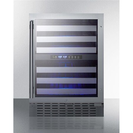 Summit Appliance SWC532BLBIST Commercially Approved Dual Zone 24" Wide Built-In Wine Cellar with Seamless Stainless Steel Trimmed Glass Door, Full Extension Shelves, Digital Thermostat & Black Cabinet<br><br> The SWC532BLBIST is a dual zone wine cellar that is ETL-S listed to NSF-7 commercial standards. The front-breathing design allows built-in installation, while the fully finished black cabinet also enables freestanding use.<br><br> Key Features:<br> - Commercial grade design meets NSF-7 standards<br> - Flexible design allows built-in or freestanding use in any 24" space<br> - Chill white and sparkling wine while preserving red in two distinct temperature zones<br> - Seamless stainless steel trimmed glass door provides an elegant view of your collection<br> - Easy temperature management with digital controls<br> - Full-extension shelving on ball-bearing glides ensures easier bottle access<br><br> Specifications:<br> - Height of Cabinet: 34.25"<br> - Width: 23.5"<br> - Depth: 23.38"<br> - Depth with Handle: 25.38"<br> - Depth with door at 90°: 45.75"<br> - Bottles: 46<br> - Defrost Type: Automatic<br> - US Electrical Safety: ETL<br> - Canadian Electrical Safety: ETL-C<br> - Sanitation: ETL-S<br> - Amps: 1.25<br> - Voltage/Frequency: 115V AC/60Hz<br> - Weight: 113 lbs.<br> - Shipping Weight: 120 lbs.<br> - Number of Zones: 2<br> - Door Swing: RHD<br> - Reversible: Yes<br> - Shelf Type: Wire<br> - Shelf Qty: 6<br> - Thermostat Type: Digital<br> - Interior Light: Yes<br> - Fan Type: Interior and Exterior<br> - Refrigerant Type: R600a<br> - Refrigerant Amount: 1.23 oz.<br> - High Side PSI: 150<br> - Low Side PSI: 50<br> - Interior 1: 11.63"x20.5"x18"<br> - Level Legs: 2<br> - Temperature Range: 41 to 64ºF<br> - Interior 2: 11.88"x20.5"x18