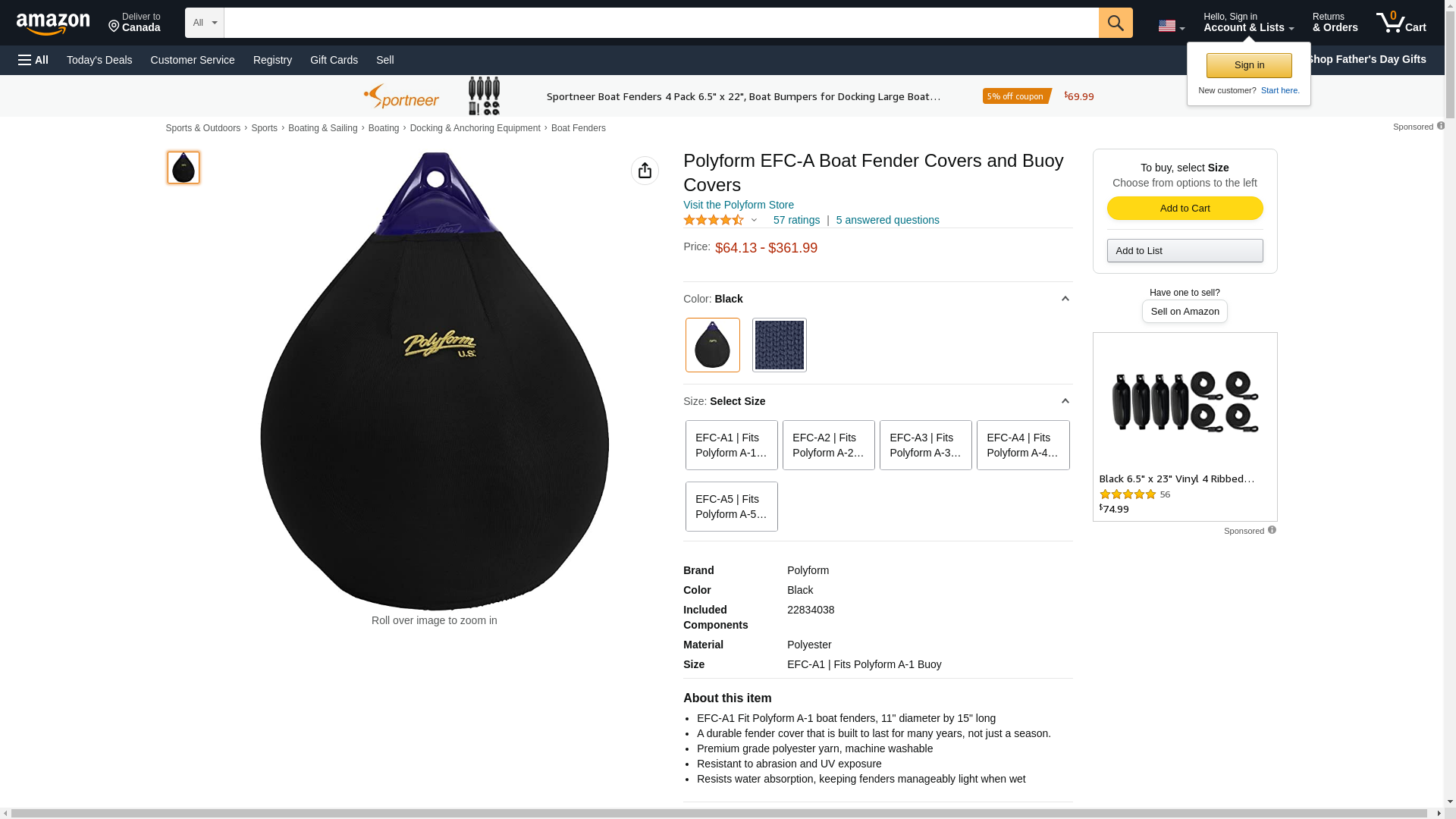 Polyform EFC-A2 Black Boat Fender Cover Fits Polyform A-2 Boat Fenders