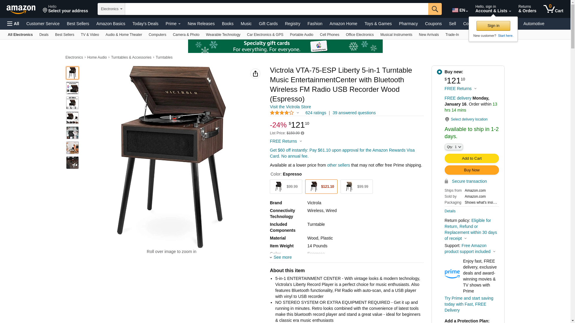 Victrola VTA-75-ESP Liberty 5-in-1 Turntable Music EntertainmentCenter with Bluetooth Wireless FM Radio USB Recorder Wood (Espresso)