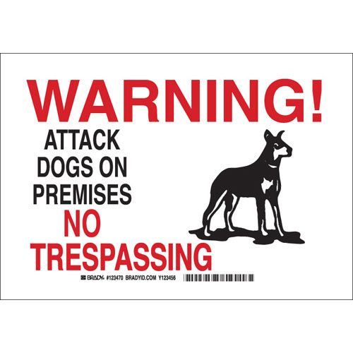 Brady 123468 WARNING! Attack Dogs On Premises No Trespassing Sign - Non-reflective Aluminum, Black/Red on White, 7 x 10