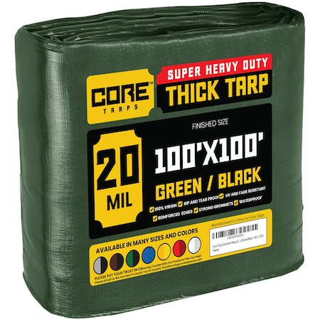 Core Tarps Extreme Heavy Duty 20 Mil Tarp Cover, Waterproof, UV Resistant, Rip and Tear Proof, Poly Tarpaulin with Reinforced Edges for Roof, Camping, Patio, Pool, Boat (Green/Black 100′ X 100′)