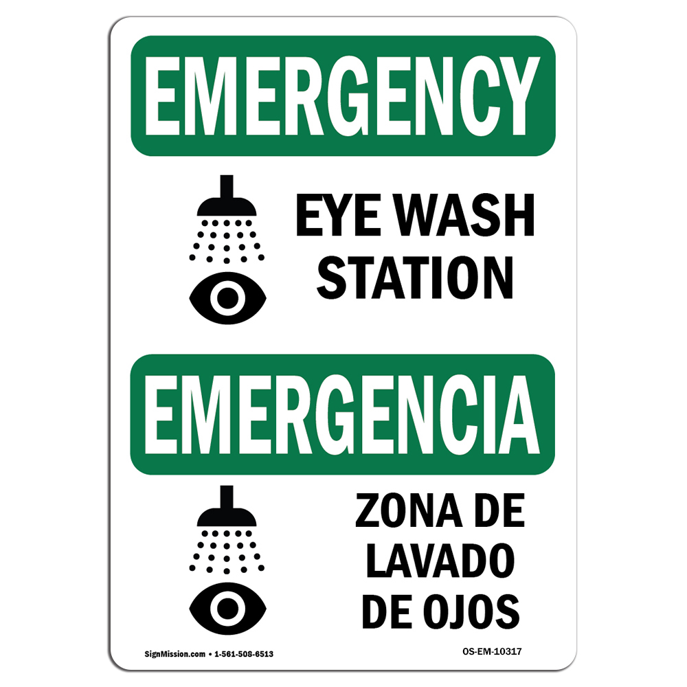 SignMission OS-EM-P-1014-L-10317 Emergency Eye Wash Station Bilingual OSHA Plastic Sign