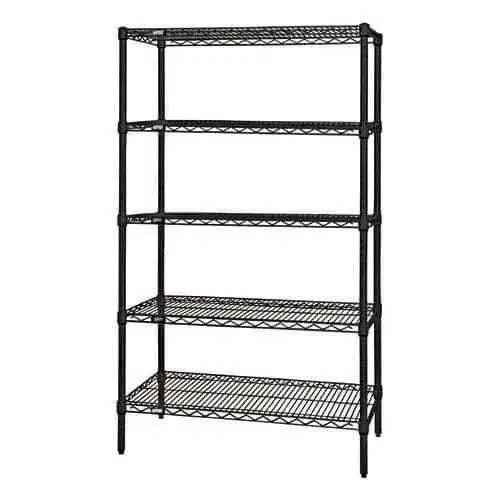 - Wire Shelving Starter Kit, 42"W x 18"D x 86"H, 600 - 800 lb. capacity, includes (5) wire shelves and (4) posts, black epoxy finish, NSF, shipped KD