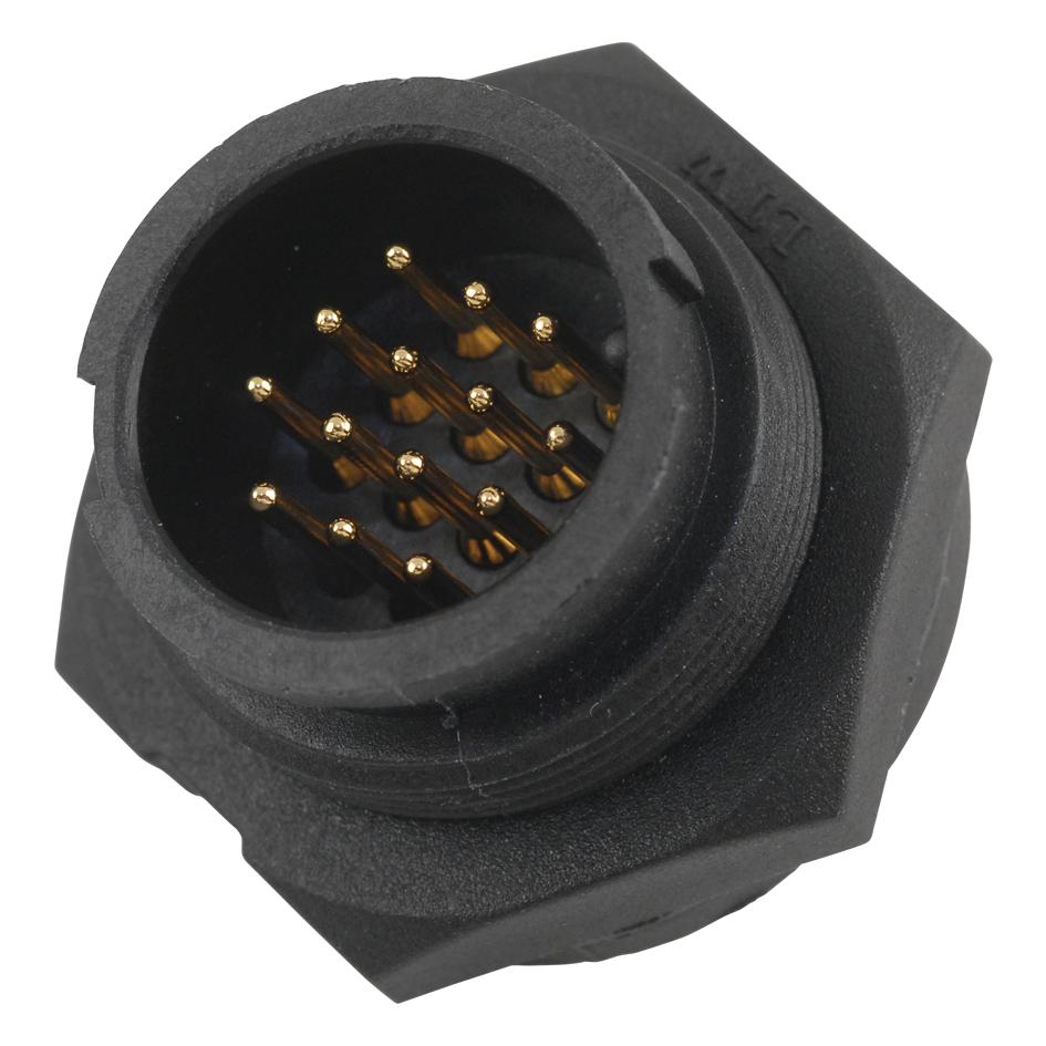 Sealing: IP67<br>Shielding: No<br>Connector Type: Circular<br>Connector Style: Plug<br>Mounting Type: Front Mount<br>Endbell Type: Circular<br>Number of Contacts: 14<br>Contact Style: Pin<br>Termination Method: 180¡ã PCB Type<br>Insert Arrangement: 14<br>Contacts Supplied: Yes<br>Contact Material: Copper Alloy<br>Contact Plating: Gold<br>Shell Material: Nylon<br>Shell Plating: No Plating<br>Shell Color: Black<br>Insert Material: Nylon<br>Amperage Rating: 5A<br>Operating Temperature: -40¡ãF to +-221¡ãF (-40¡ãC~105¡ãC)<br>Contact Mating life: 1000<br>RoHS: Yes
