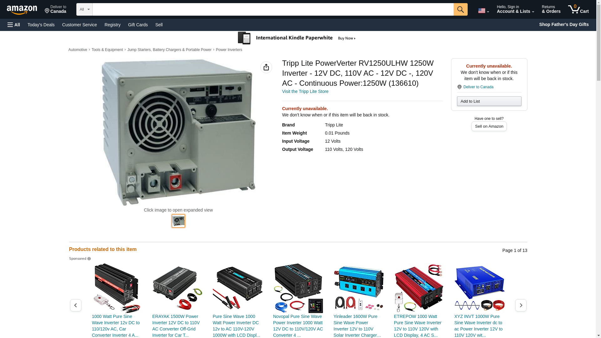 Tripp Lite PowerVerter RV1250ULHW 1250W Inverter - 12V DC, 110V AC - 12V DC -, 120V AC - Continuous Power:1250W (136610)