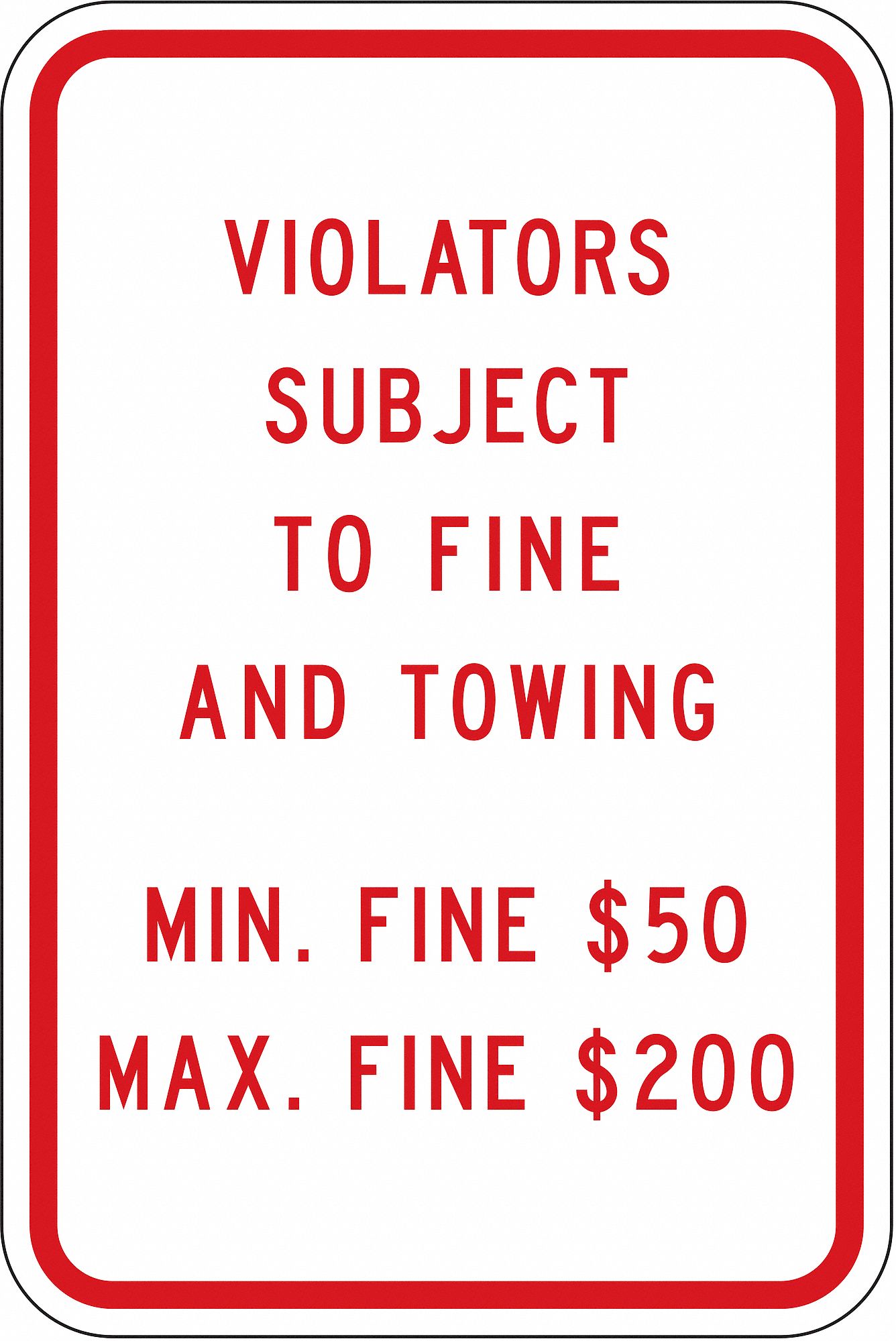 | Feature | Price For: Each UV Resistant: Yes Header: No Header Double-Sided: No Operating Temp. Range: -30 Degrees to 200 Degrees F Legend: Violators Subject To Fine and Towing Min. Fine $50 Max. Fine $200 Standards: MUTCD, ADAAG 4.6.4, ADA Legend/Background Color: Red/White Sign Shape: Rectangle Retroreflective Grade: High Intensity Prismatic Width: 12" Legend Style: Text |