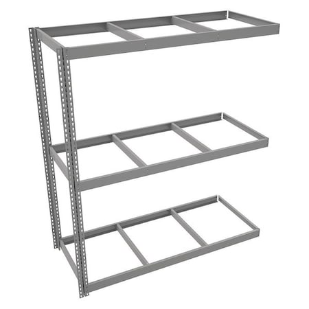 <p>Boltless Shelving, Shelf Configuration Single Straight, Width 73 In., Depth 30-5/8 In., Height 84 In., Number of Shelves 3, Material Steel, Beam Capacity 2000 lb., Shelf Capacity 2000 lb., Decking Material None, Color Gray, Finish Electro Coat, Shelf Adjustments 1-1/2 In., Includes (2) Posts and (12) Beams</p><p><b>Specifications: </b><ul><li>Green Certification or Other Recognition: SCS Indoor Advantage Certified</li><li>Beam Capacity: 2000 lb.</li><li>Width: 73"</li><li>Finish: Electro Coat</li><li>Material: Steel</li><li>Number of Shelves: 3</li><li>Shelf Capacity: 2000 lb.</li><li>Color: Gray</li><li>Decking Material: None</li><li>Shelf Style: Single Straight</li><li>Shelf Adjustments: 1-1/2"</li><li>Item: Boltless Shelving</li><li>Green Environmental Attribute: Minimum 30% Post-Consumer Recycled Content</li><li>Includes: (2) Posts and (12) Beams</li><li>Depth: 30-5/8"</li><li>Height: 84"</li></ul></p>