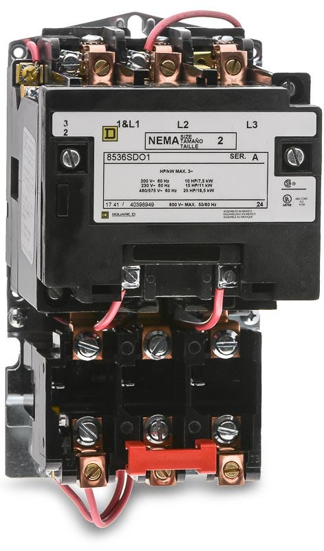 Full-voltage starters start and stop 1- and 3-phase AC motors. Trip-free construction allows overload relay to trip even if reset lever is blocked or in the reset position. Open enclosure Normally open holding circuit contact for 3-wire control. Angled contacts provide high contact pressure and positive seating. Provide Class 20 protection.<br /><br /> Item: Magnetic Motor Starter<br /> NEMA Size: 2<br /> Amps AC: 45<br /> Coil Volts: 208VAC<br /> Enclosure NEMA Rating: No Enclosure<br /> HP @ 3 Phase - 240V: 15<br /> HP @ 3 Phase - 480V: 25<br /> Action: Nonreversing<br /> Number of Poles: 3<br /> HP @ 3 Phase - 208V: 10<br /> HP @ 3 Phase - 575V: 25<br /> Height: 7.81"<br /> Width: 4.31"<br /> Depth: 4.94"<br /> Standards: UL Listed/CSA Certified<br /> Starter Type: NEMA<br /> Hz: 60<br />