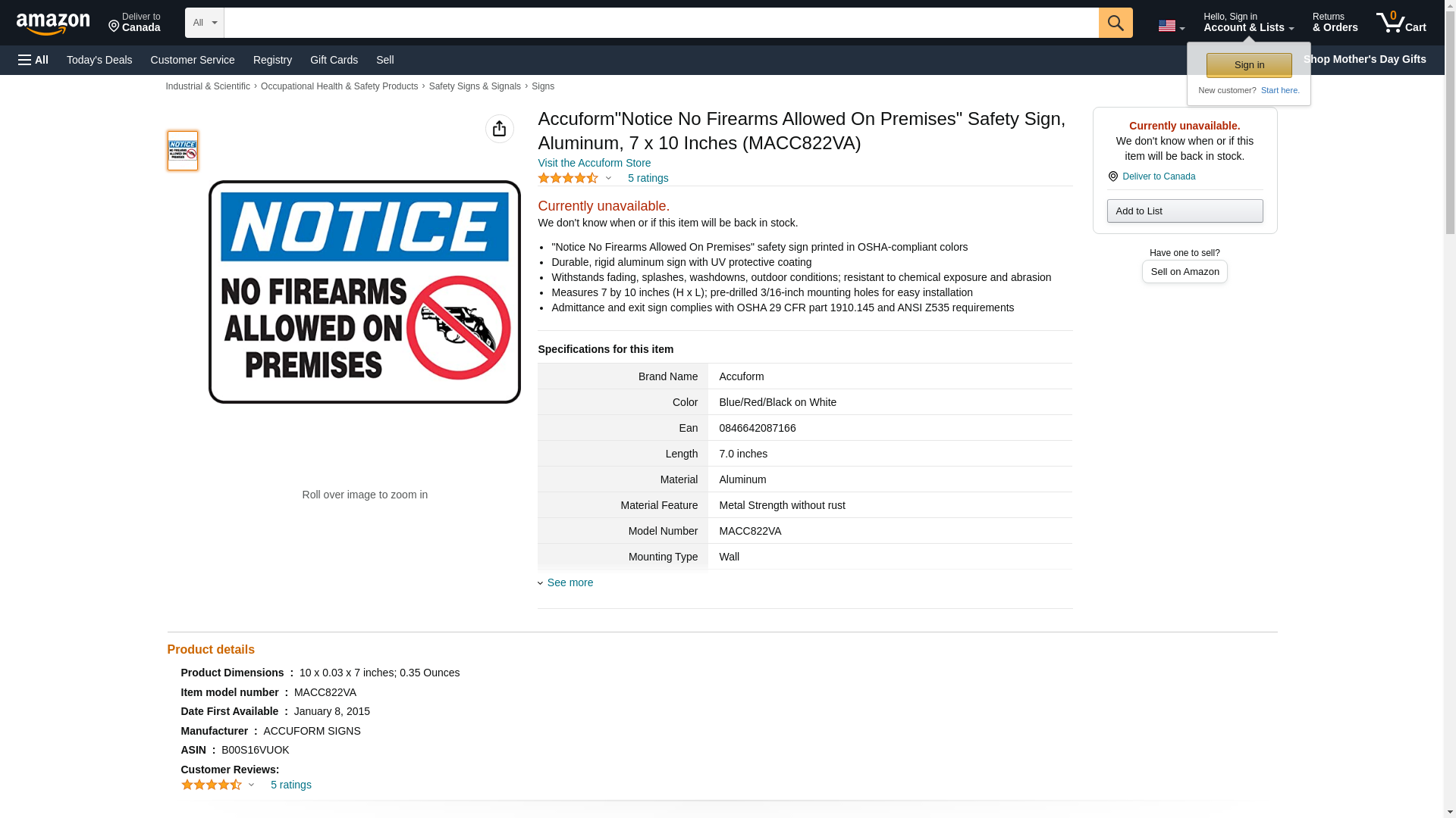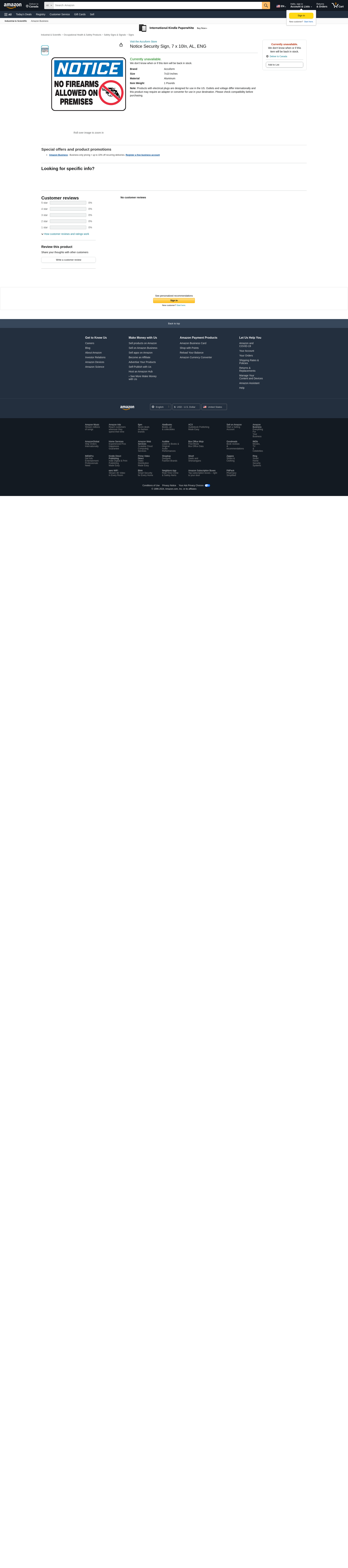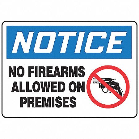 - Legend: No Firearms Allowed On Premises Header Legend Color: White Sign Material: Aluminum Legend Style: Text and Symbol Header: Notice Operating Temp. Range: -40 Degrees to 250 Degrees F Thickness: 0.040" Width: 10" Height: 7" Sign Mounting Style: With Mounting Holes Header Background Color: Blue Country of Origin (subject to change): United States