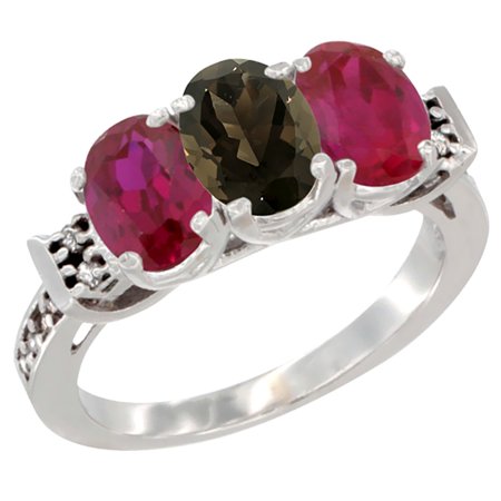 10K White Gold Natural Smoky Topaz & Enhanced Ruby Sides Ring 3-Stone Oval 7x5 mm Diamond Accent, sizes 5 - 10