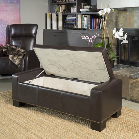 <ul> Includes: One (1) storage ottoman <li>Materials: Bonded leather with a wooden frame</li> <li>Upholstery color: Brown</li> </ul>