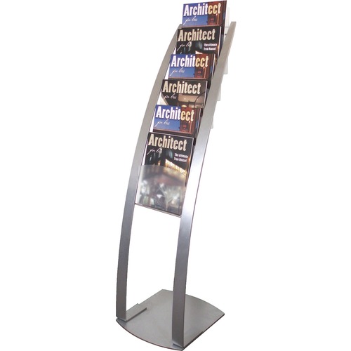 - Contemporary floor stand features sleek curves and open design to create an inviting literature display. Six large-capacity compartments accommodate magazine-size materials. Each pocket holds a stack of literature up to 1-1/2" thick. Ideal for reception areas, waiting rooms and trade shows. Frame is made of metal frame. Pockets are made of frosted plastic.