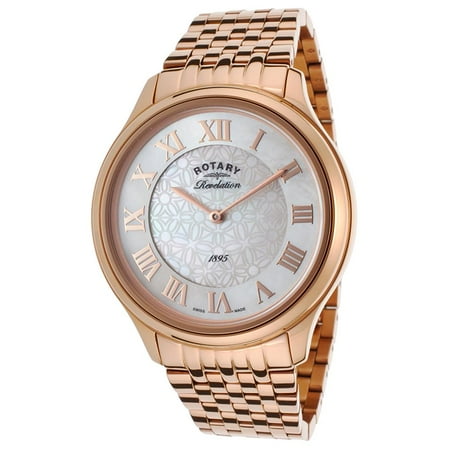 Your mood can change as often as the time does. Rotary's Revelation line introduces a rose-tone stainless steel watch with two visually-appealing dials. One side brings you a chocolate brown dial with matching hands, along with rose-tone indices. Flip it around and enjoy a white mother of pearl dial adorned with Roman numerals and rose-tone hands. No matter which side you choose to show off, you'll be doing it in style. SKU: ROTARY-LB02967-06-10 <br /> <br />Your mood can change as often as the time does. Rotary's Revelation line introduces a rose-tone stainless steel watch with two visually-appealing dials. One side brings you a chocolate brown dial with matching hands, along with rose-tone indices. Flip it around and enjoy a white mother of pearl dial adorned with Roman numerals and rose-tone hands. No matter which side you choose to show off, you'll be doing it in style. <ul> <li>Series:Revelation</li> <li>Movement:Quartz</li> <li>Case Diameter (mm.):42</li> <li>Case Thickness (mm.):13</li> <li>Weight (g.):143</li> <li>Features:Reverse side: White mother of pearl dial, Rose-Tone hands, Rose-Tone Roman Numerals</li> <li>Gender:Women</li> <li>Case Shape:Round</li> <li>Case Finish:Polished</li> <li>Case Color:Rose-Tone</li> <li>Case Material:Stainless Steel</li> <li>Case Back Type:Exhibition snap-down</li> <li>Crown Type:Push/pull</li> <li>Crystal Type:Mineral</li> <li>Hand Color(s):Dark Brown</li> <li>Dial Color Primary:Dark Brown</li> <li>Dial Finish:Brushed</li> <li>Dial Markers:Indices</li> <li>Band Finish:Polished</li> <li>Band Color:Rose-Tone</li> <li>Band Type:Bracelet</li> <li>Band Material:Stainless Steel</li> <li>Movement Origin Country:Switzerland</li> <li>Water Resistance:30M</li> <li>Band Length (in.):8.75</li> <li>Band Width Between Lugs (mm.):21</li> <li>Band Width (mm.):18</li> <li>Clasp Type:Push button fold-over</li> </ul>