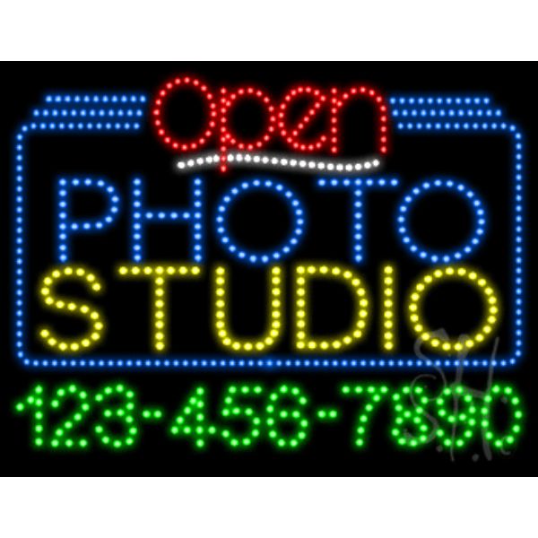 Everything Neon L100-6620 24 x 31 x 1 in. Photo Studio Open with Phone Number Animated LED Sign - Yellow, Red & Whit