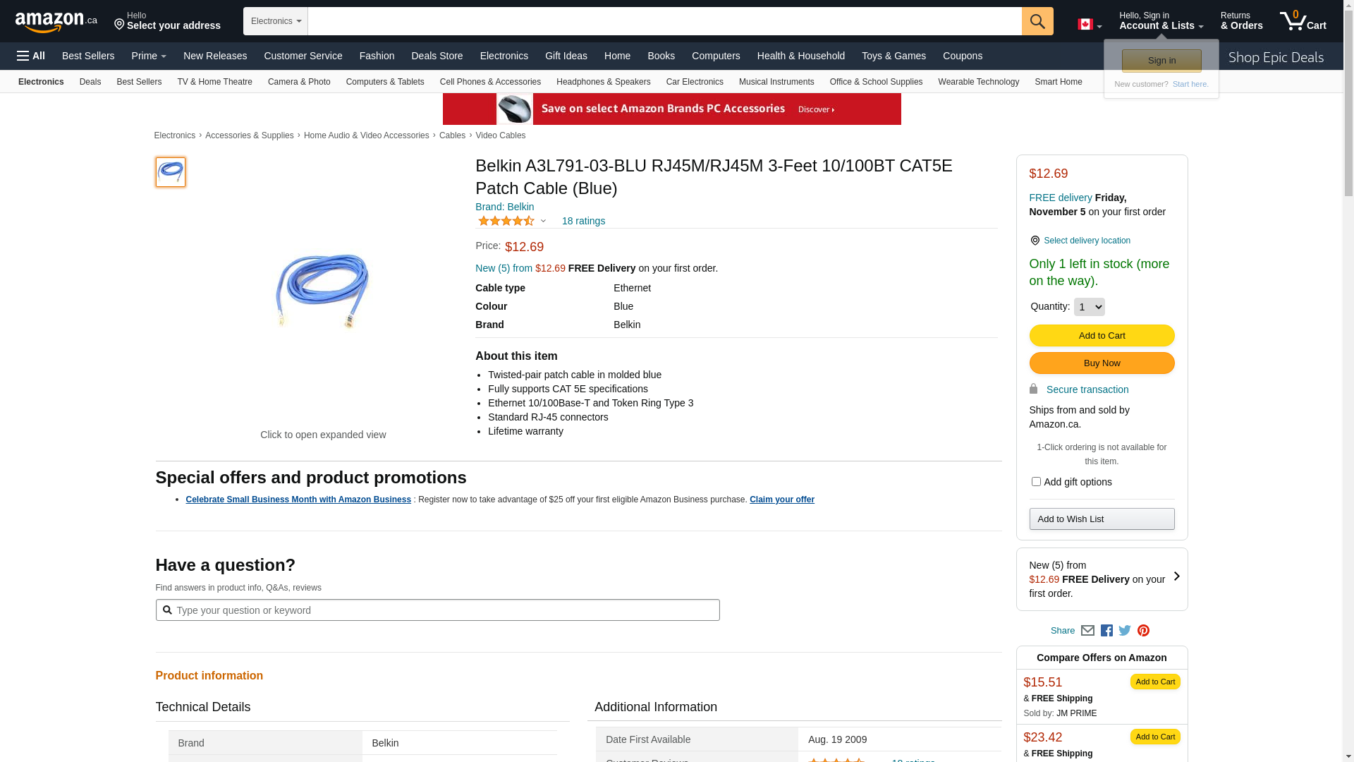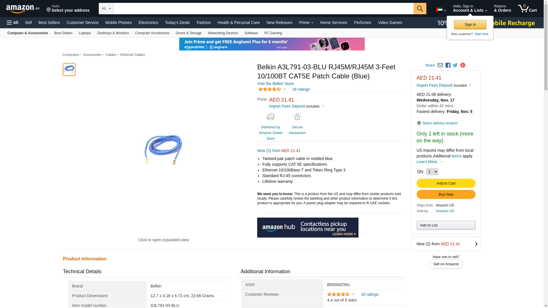 | Feature | BELKIN CAT5E 3FT BLUE PATCH CORD |