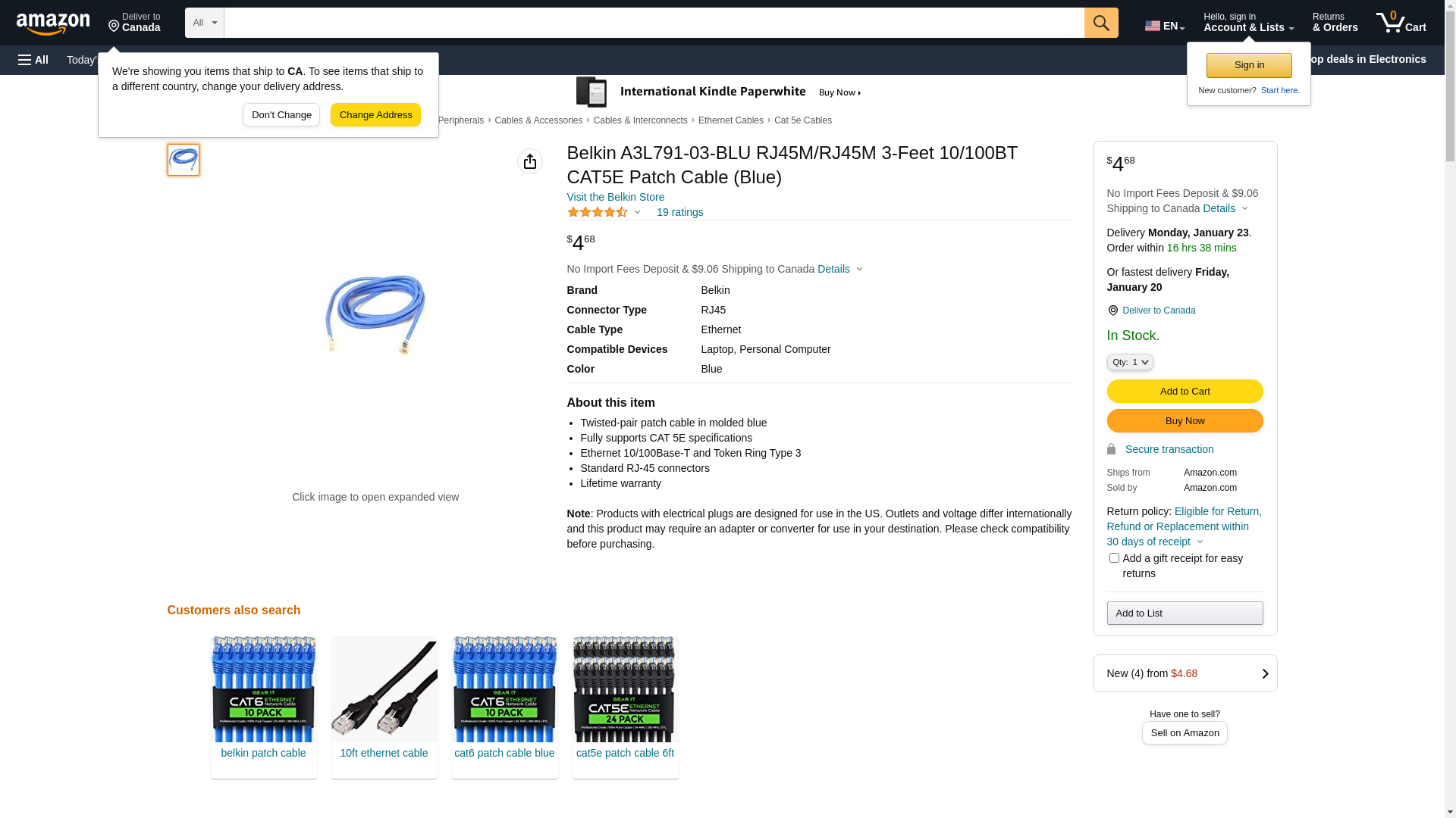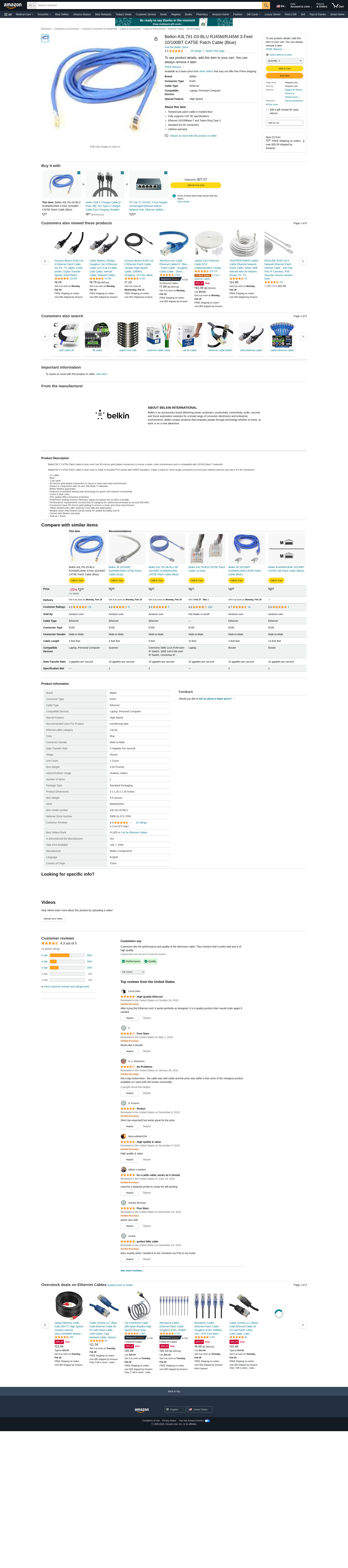 The RJ45 Cat 5e patch is perfect for use with 10/100 Base-T networks.<br/><br/><strong>Brand Name</strong>: Belkin<br/><strong>Cable Length</strong>: 3 ft<br/><strong>Cable Type</strong>: Category 5e<br/><strong>Color</strong>: Blue<br/><strong>Connector on First End</strong>: 1 x RJ-45 Male<br/><strong>Connector on Second End</strong>: 1 x RJ-45 Male<br/><strong>Product Type</strong>: Network Cable<br/><br/><br/><br/><br/>Height 1.00 inches<br/>Width 3.00 inches<br/>Length 5.00 inches<br/>Shipping Weight 0.10 pounds<br/>Pallet Quantity 0<br/>
