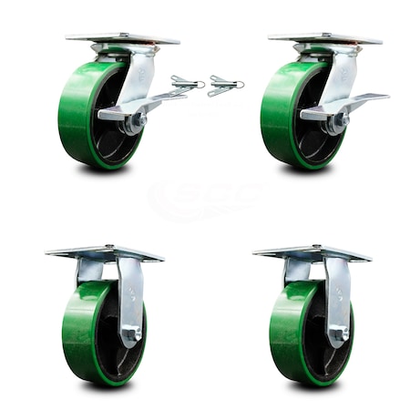 Heavy Duty Large Top Plate Polyurethane on Cast Iron Swivel Caster w/Main. Free Bearings Set of 4 w/6" x 2" Green Wheels-Includes 2 Swvl with Brakes and Bolt on Swvl Lcks&2 Rigid- Service Caster Brand