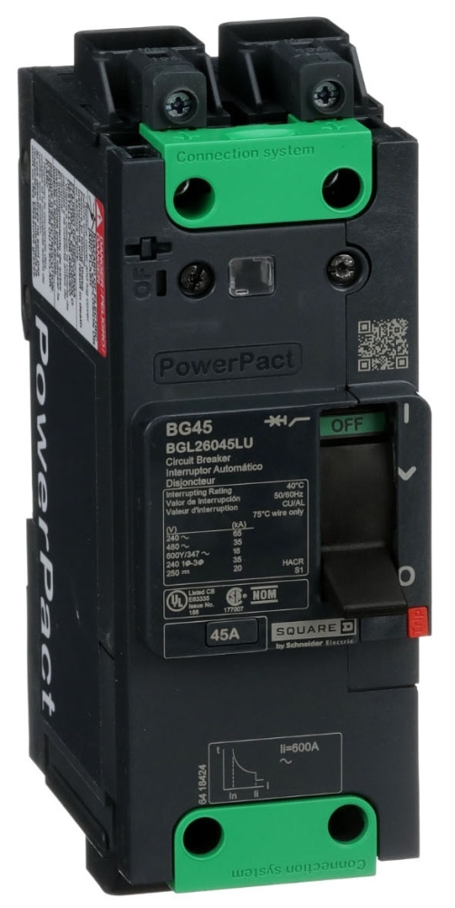 <br /><br /> Item: Circuit Breaker<br /> Amps: 45<br /> Number of Poles: 2<br /> Circuit Breaker Type: Standard<br /> AC Voltage Rating: 347/600VAC<br /> DC Voltage Rating: Not Rated<br /> For Use With: Industrial Control Panels, Electrical Distribution Equipment<br /> Series: PowerPact B<br /> Trip Type: Thermal Magnetic<br /> Terminal Connection: Line Side Lug with Control Wire/Load Side Lug<br /> Max. AIR Rating: 65 kA<br /> Phase Connection: Not Applicable<br /> Mounting: Clip-On<br /> Height: 6.22"<br /> Width: 2.97"<br /> Depth: 4.01"<br /> Min. Wire Size: 6 AWG, 14 AWG<br /> Max. Wire Size: 2/0 AWG, 3/0 AWG<br /> Instantaneous Trip: Fixed<br /> Frame Size: 45/BG<br /> Phase: 1<br /> Standards: UL Listed, CSA Certified, CCC, IEC, EAC, NOM