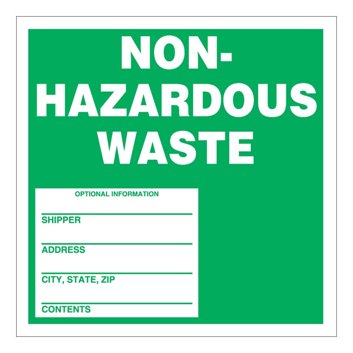 Accuform MHZW11EVC Adhesive-Poly Vinyl Hazardous Waste Label, Legend "NON-HAZARDOUS WASTE - SHIPPER - ADDRESS - CITY,STATE,ZIP - CONTENTS - ", 6" Length x 6" Width x 2.6 mil Thickness, Green/White (Pack of 100)