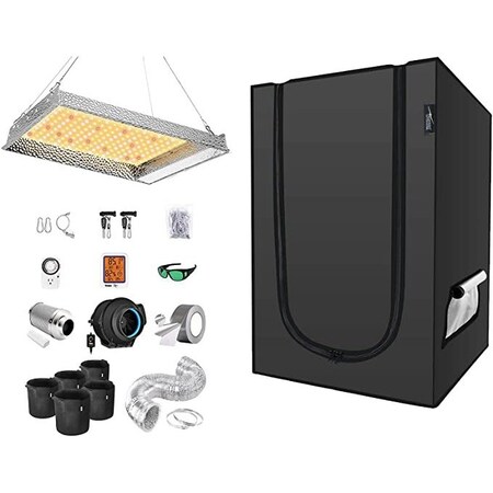 - Package includes: LED grow light, 24"x24"x36" grow tent, 4" inline fan, 4" carbon filter, 4" 8' ducting, 5 gallon plant bag * 5, ducting repair adhesive tape, hygrometer thermometer, mechanical timer, 3' x3' elastic trellis netting, grow room glasses