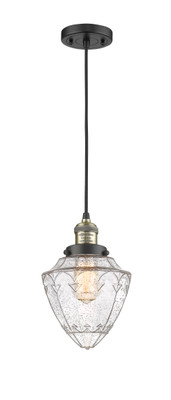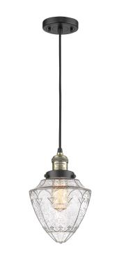 This 1 light Mini Pendant from the Franklin Restoration Bullet collection by Innovations Lighting will enhance your home with a perfect mix of form and function. The features include a Black Antique Brass finish applied by experts. Product Features Include: Brand: Innovations Lighting, Collection: Franklin Restoration Bullet, SKU: 201C-BAB-G664-7, UPC: 729625042966, Category: Mini Pendant, Finish: Black Antique Brass, Glass: Seedy, Material: Steel/Cast Brass/Glass, Designer: Bruno Marashlian, Width: 7.00 in., Height: 14.50 in., Max Height: 134.50 in., Diameter: 7.00 in., Backplate/Canopy Width: 4.50 in., Backplate/Canopy Length: 0.00 in., Backplate/Canopy Thickness: 0.75 in., Weight: 2.75 lb., Included Lead Wire: 10 Feet Of Black Textured Cord, Warranty: 2 Year Finish, Lifetime Electrical, Bulbs Included: Yes, Bulb Category: Incandescent, Primary Bulb(s): 1 x 60.00 watts Medium Base ST64 Vintage, Color Temperature: 2200K, Color Rendering Index: 99.9000, Total Lumens: 220, Voltage: 120, Safety Rating: Damp Location