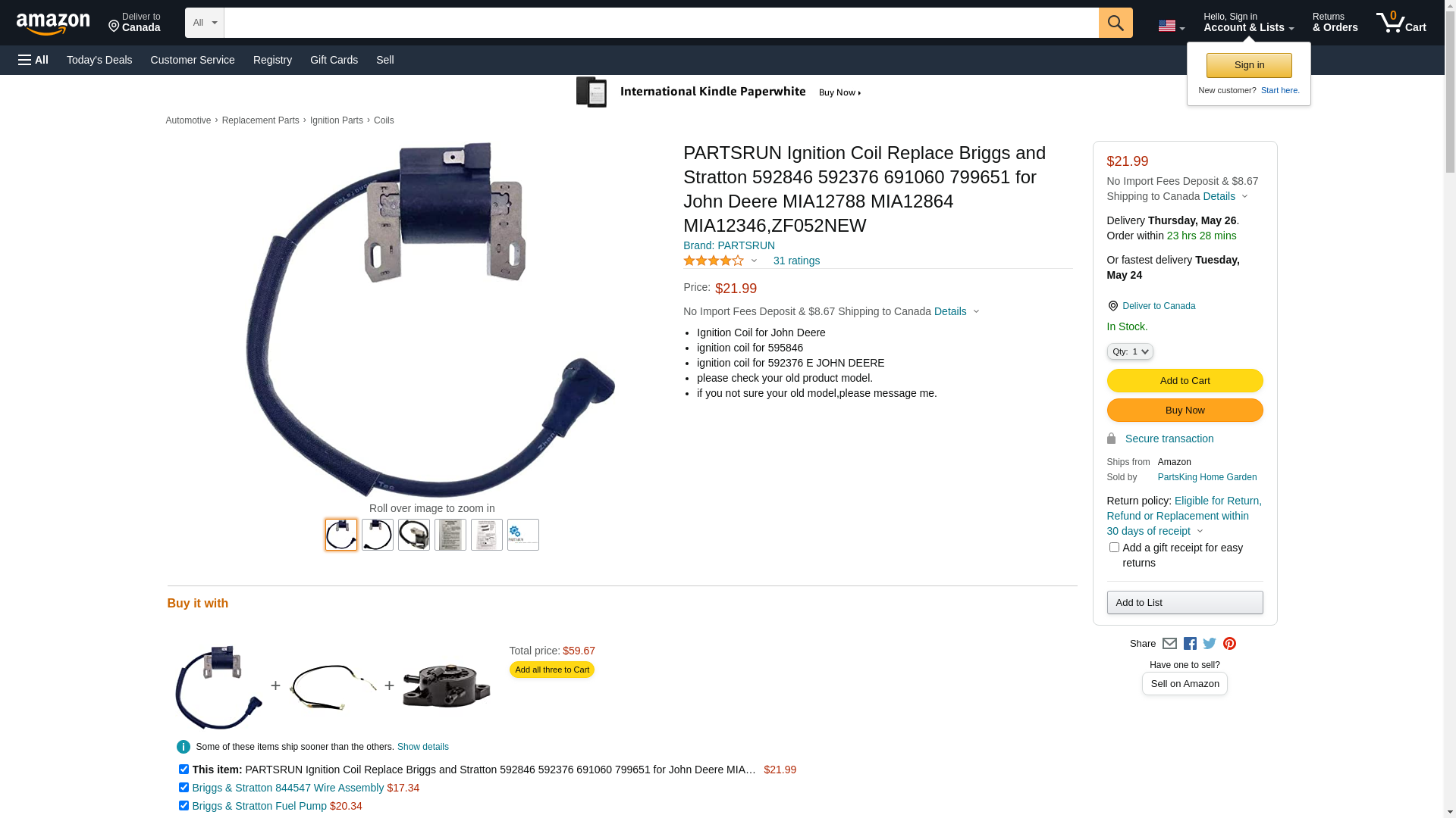 PARTSRUN Ignition Coil Replace Briggs and Stratton 592376 691060 799651 For JOHN DEERE MIA12788 MIA12864 MIA12346,ZF-IG-A00052-NEW